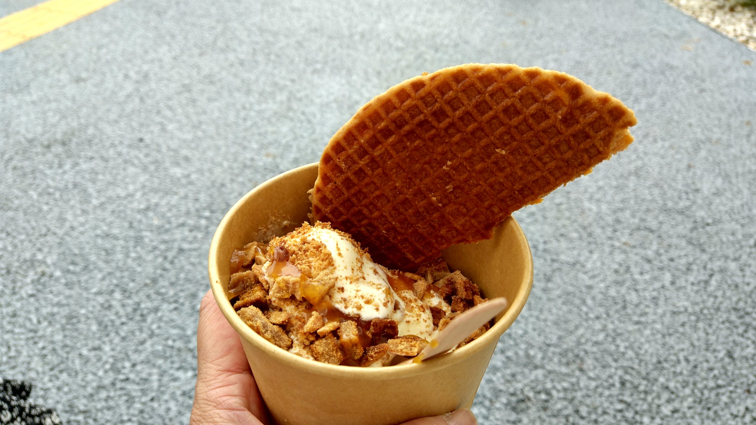 ストロープワッフルを買ってみました。市販のとは違ってまだあたたかい。中身のキャラメルも柔らかくて・・